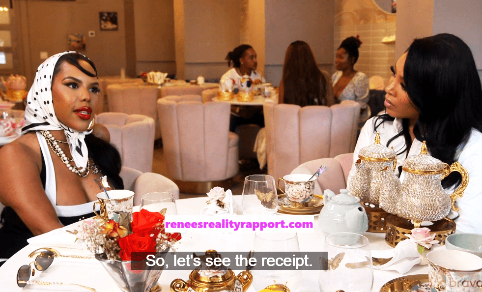 Porsha, Kelly and newcomer, not sure, they didn’t show the name, meet at the tea place. And it’s not your typical tea and crumpets. It’s some tea with some spirit. This could go badly.