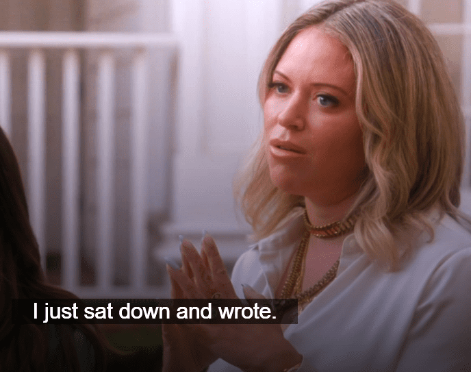 She gets asked if has a ghost writer, which she does, and Amanda gets judgy because she ‘just sat down and wrote’ HER book.