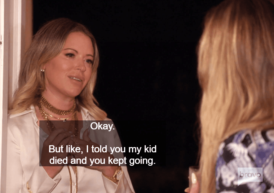 Everyone has to be oh-so-sensitive to Dorit when she wants to ramble on and on about PK, but Amanda mentions her baby died, and Dorit is just like ‘oh that’s too bad’ so back to ME. Like woman are you OKAY??