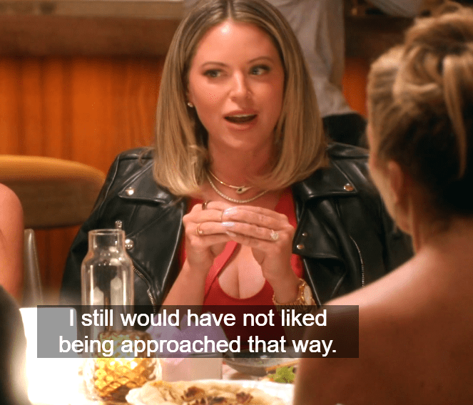 Rachel goes on some kind of diatribe, siding with Dorit of course. A newbie isn’t going to side with another newbie. She knows where her bread is buttered. She’s going to back up the vet. She needs to be the ‘cool girl.’ Rachel seems to be referring to herself and not so much Dorit.