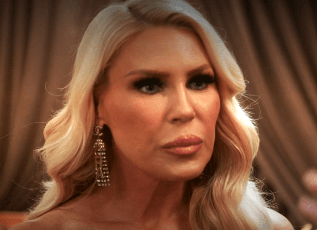 Tamra and Jo enter and this is Gretchen’s face when she sees Jo. Whatever she is doing to her face is so sad. It’s ruined. I assume it’s over botoxed and/or filled if it’s not ‘surgeries.’