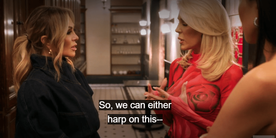 Gretchen tells Tamra she wants her to stop harping on this, which is a perfect way to put it, actually.