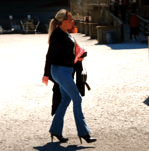 Shannon arrives late looking very disheveled, in what couldn’t be a more unflattering outfit. Jeans that are way too tight and short with uncomfortable AF looking stiletto style booties that she can barely walk in. Oh, and a black top of course.