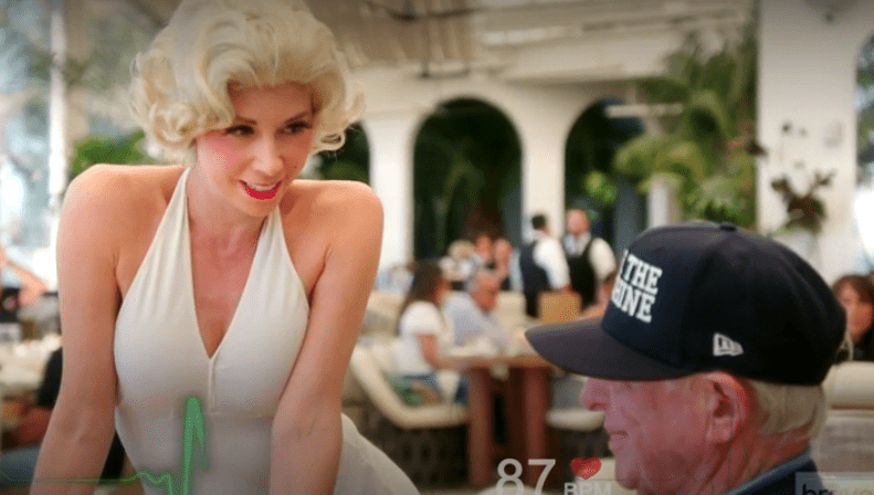 She tries to talk to this 96 year old man about her Housewife issues with Tamra, as if he cares. As if. He has a blank stare. He can’t even pretend to look interested, and who can blame him?
