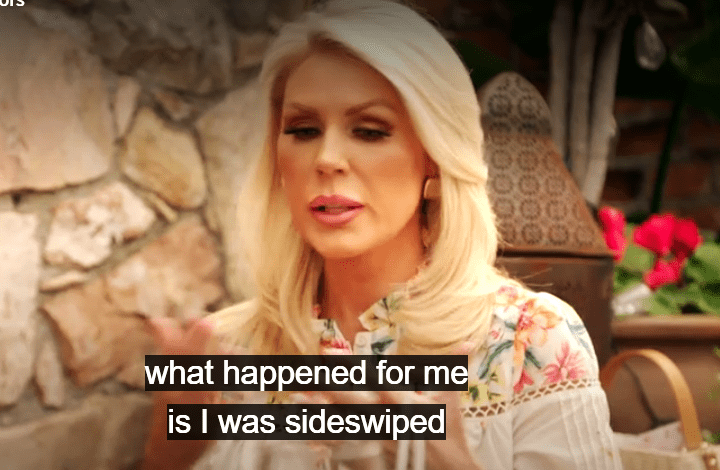 She tells Kiki she was ‘side swiped’ from this revelation. Think blind-sided is what she meant. Housewives and their constant misuses and mispronunciations of words and phrases.