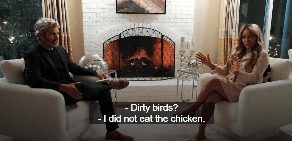 Andy plays some clips of the reunion last season when her conviction was addressed. She’s pissed at what they’re saying. Those lips are pursed.