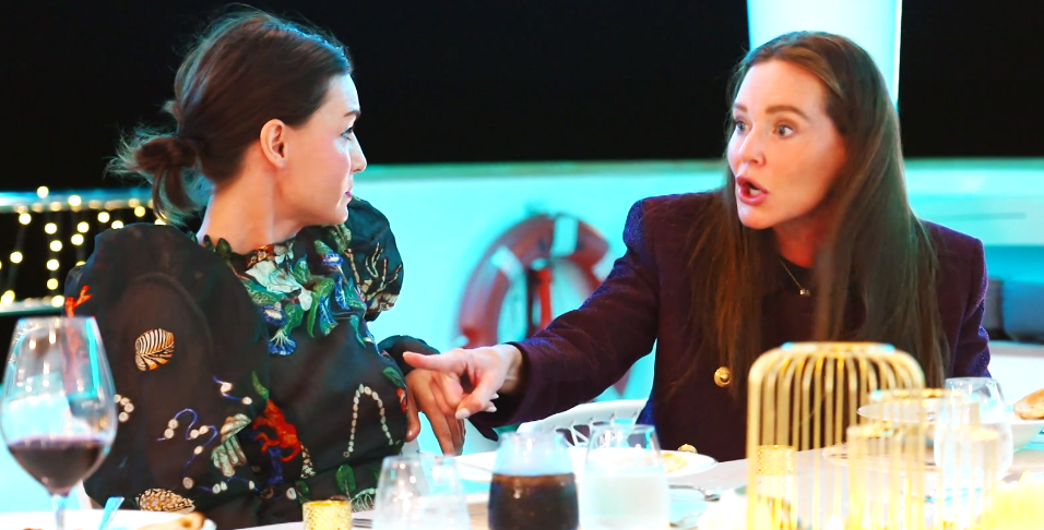 Bronwyn arrives by boat in the ocean where the yacht is parked. It’s clear these yachts don’t go very far into the water.