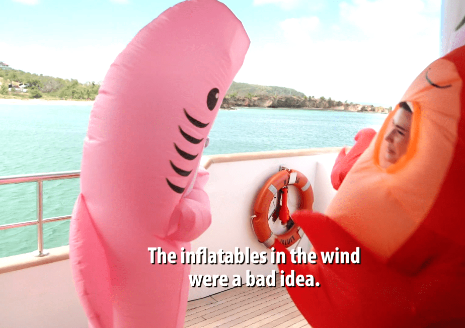 Meredith and Bronwyn conspire to throw the unicorn overboard. Now that is a GREAT idea. They have to be in Bronwyn’s blow up costumes. They’re so inconspicuous.