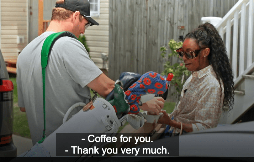 Venita approaches Austen carrying all of her bags and what-not and a tray of coffees. Austen, as he tells her she has “a lot of things” all that he does is take HIS coffee from the tray. Can’t even take the entire tray from her!!