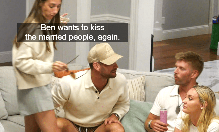 Bailey looks extremely put off, as she should. Everyone, including Ben, bursts into laughter over Jesse’s comment that “Ben wants to kiss the married people!”