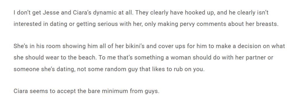 Like you close your eyes and it’s the exact same convo as last summer when he told Ciara to stop talking to him or whatever because Lexi was getting mad about it. When she confronted him that was a dumb thing to say, he said he was just joking.