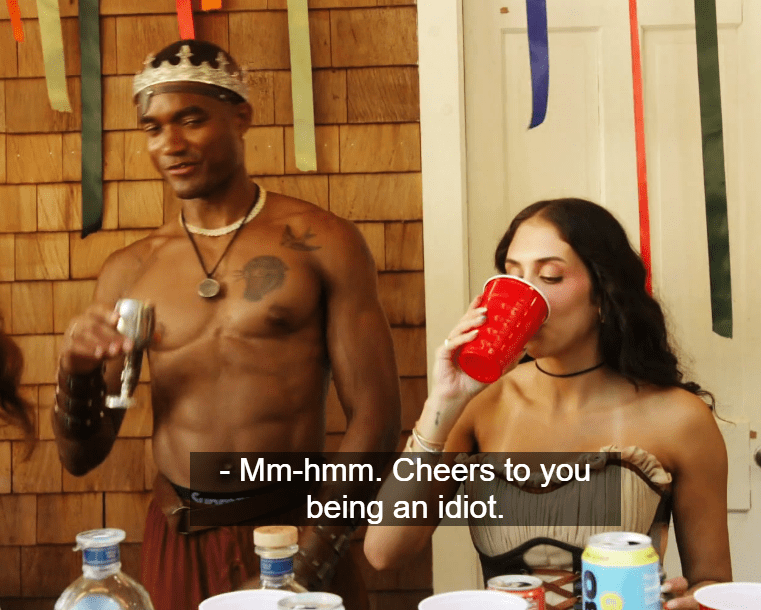 Ciara pouts and cries during the West vs Jesse jousting, and runs in the house and crawls into bed, when West makes an ‘asking permission’ joke after the two guys share a kiss. Maybe like Southern Charm, these guys all pretend to be straight too.