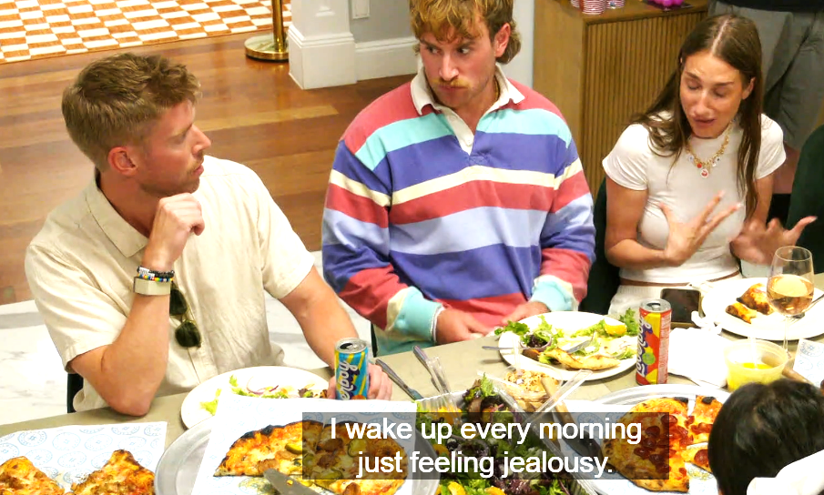 She thinks (because she’s not listening) that he says that she’s jealous, so she goes on this whole tangent making fun of that.